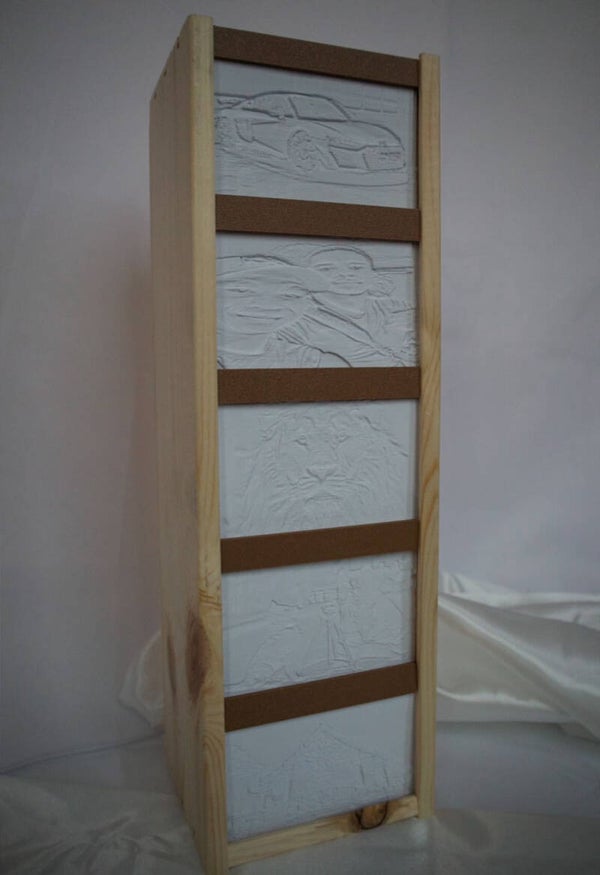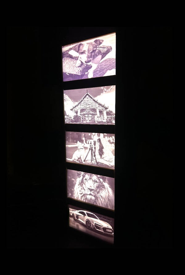 Deze sfeervolle creatie is handgemaakt van een gerecyclede wijnkist en voorzien van zelfontworpen lithophanes met jouw favoriete foto’s of ontwerpen.